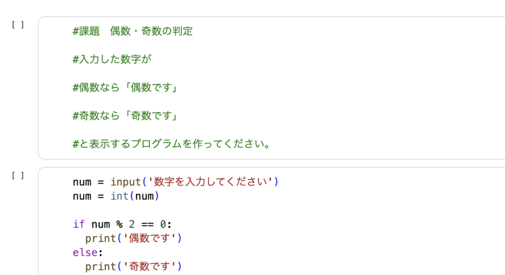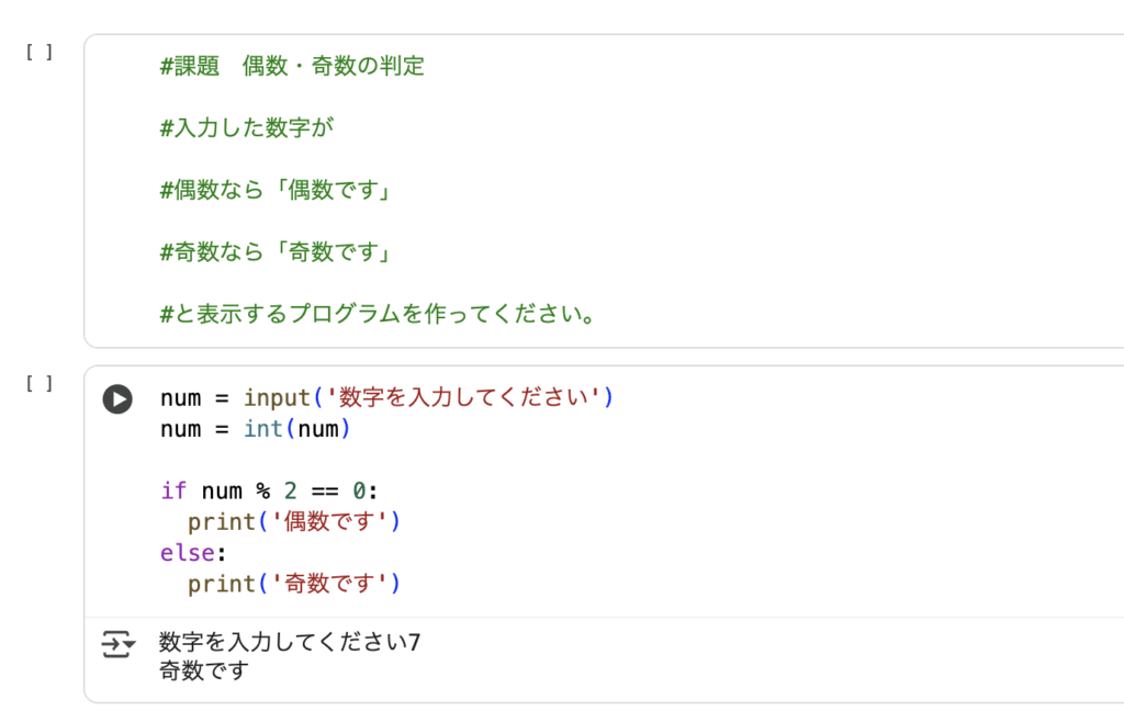 今回は「入力した数が偶数か奇数かを判定するプログラム」を作成しました。